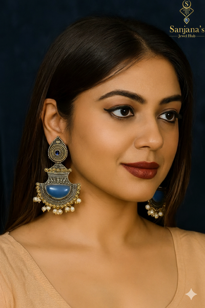 Dual-Tone Metal: They have a distinctive dual-tone finish, combining oxidized (darkened) silver-tone metal with gold-toned detailing, especially visible around the blue stones and along the edges. This contrast adds a lot of depth and richness.